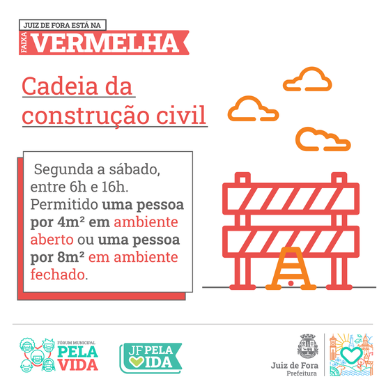 Com as mudanças na Faixa Vermelha, ficou definido que na Construção civil, o horário de funcionamento das obras é determinado por acordo coletivo. Permitido uma pessoa por 4m² em ambiente aberto ou uma pessoa por 8m² em ambiente fechado. Na Cadeia da construção civil, o funcionamento vai ser de Segunda a sábado, entre 6h e 16h. Permitido uma pessoa por 4m² em ambiente aberto ou uma pessoa por 8m² em ambiente fechado.